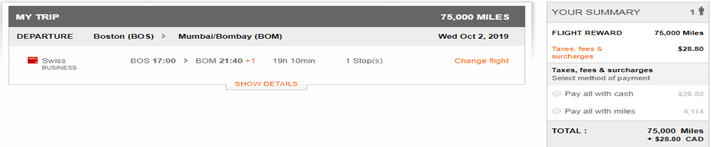 Instead, I found Business Class on SWISS Air from Boston- for 75,000 MR points + CAD $28.8 (USD $22) in taxes and fees per person. (My actual award flight had 2 stops at Zurich and New Delhi)