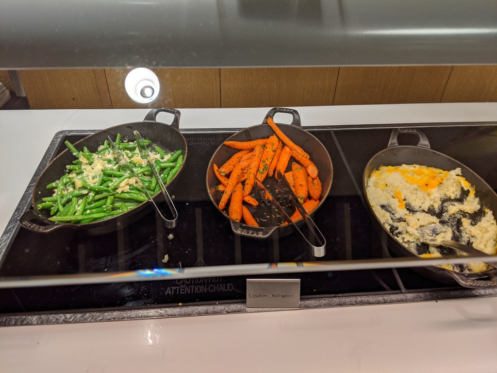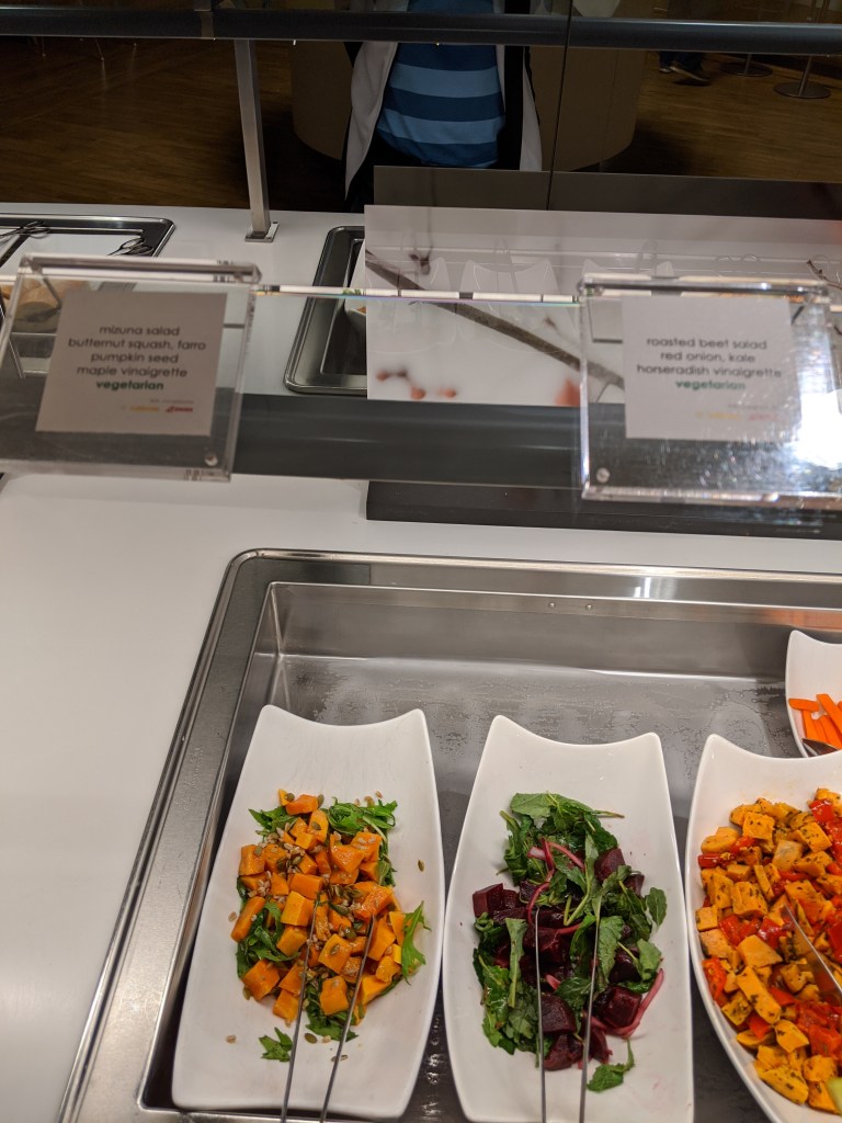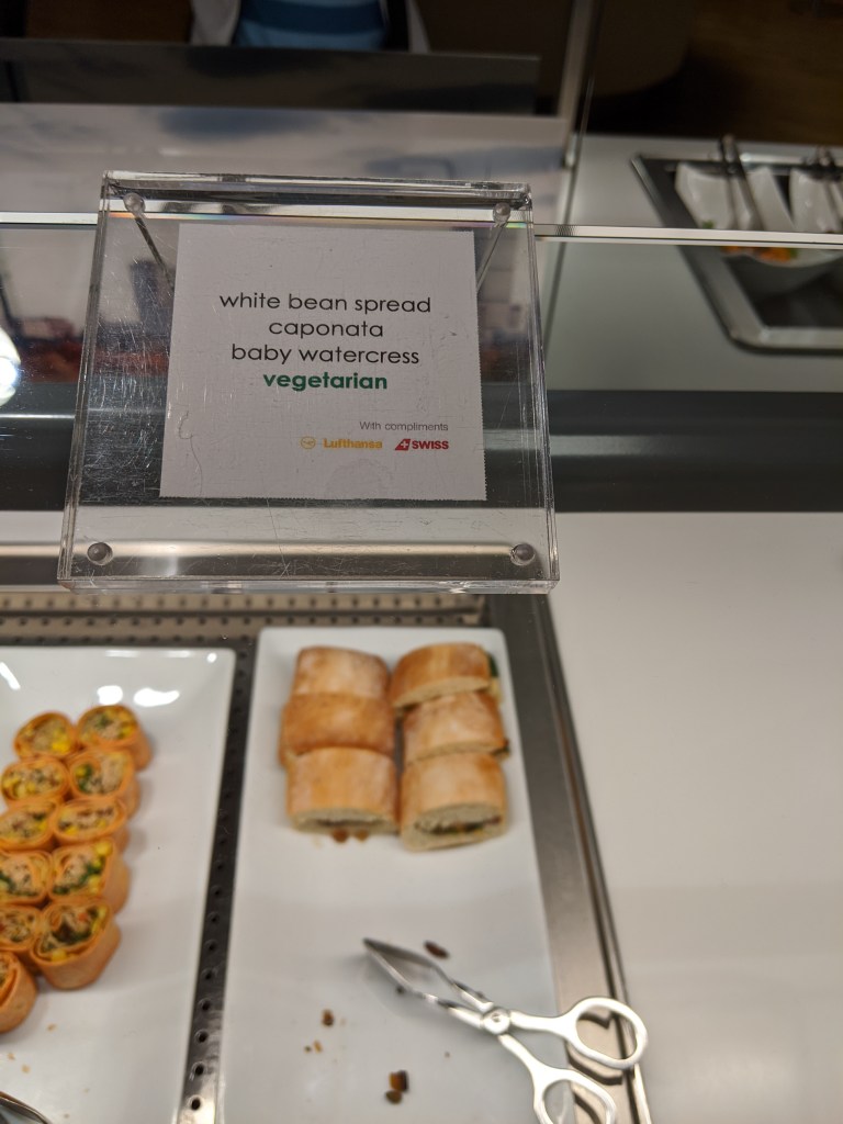The Bar wasn’t extravagantly big, but still offered good selection of alcoholic drinks – Champagne & Wines, Spirits and Beers, all of which is on the house. I wanted to try out German beers but wasn’t familiar with brands. The bartender eagerly offered suggestions and recommended Spaten Oktoberfest which I really liked. There are few bar stools in case you want to hang out by the bar. The food buffet had a good spread and offered mix of vegetarian and non-vegetarian options. Since we were vegetarian, we preferred salads, cheese, Bean Caponata and fresh juices. I am not sure if they offer an à la carte menu.